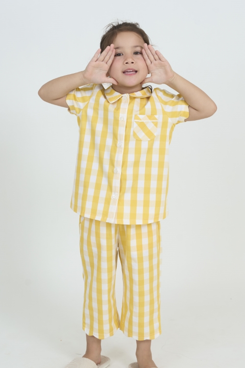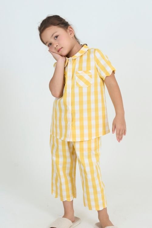 Bộ đồ kate lửng cho bé gái, với áo cổ tròn lá sen và quần lửng xinh xắn, là lựa chọn hoàn hảo để bé yêu tự tin mặc hè.