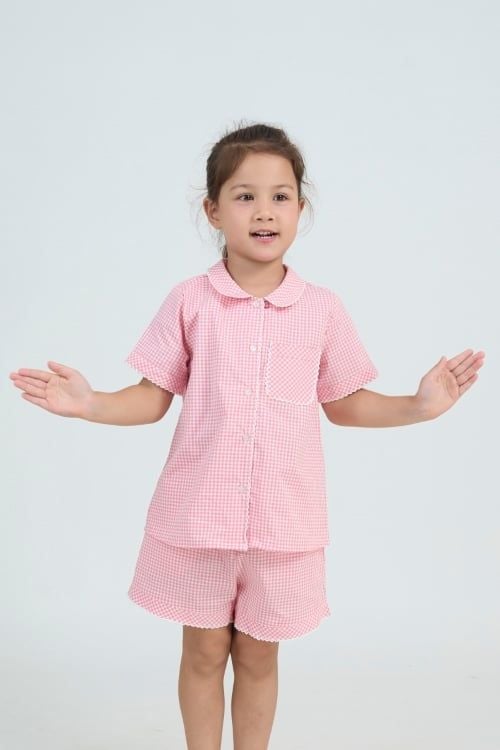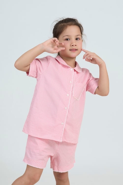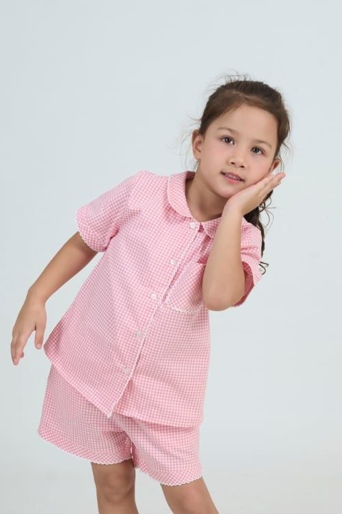 Bộ đồ ngủ pijama với thiết kế cổ lá sen đáng yêu với điểm nhấn là những đường viền rode, tay áo ngắn tạo sự thoải mái tối đa cho bé khi vận động.