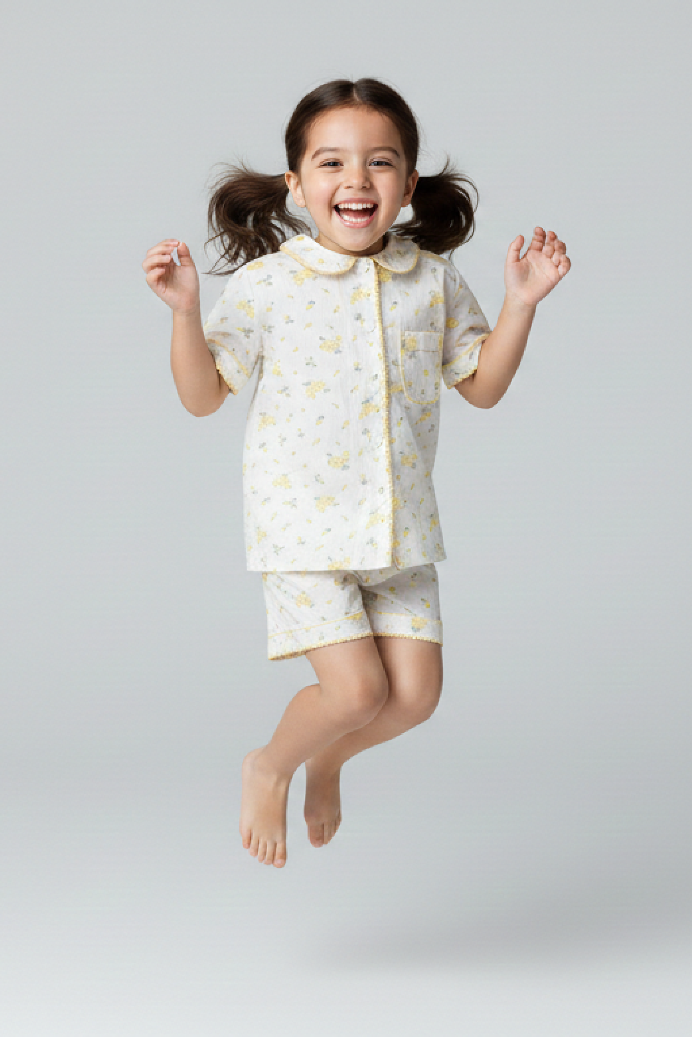 Bộ đồ ngủ pijama với thiết kế cổ lá sen đáng yêu với điểm nhấn là những đường viền rode, tay áo ngắn tạo sự thoải mái tối đa cho bé khi vận động.
