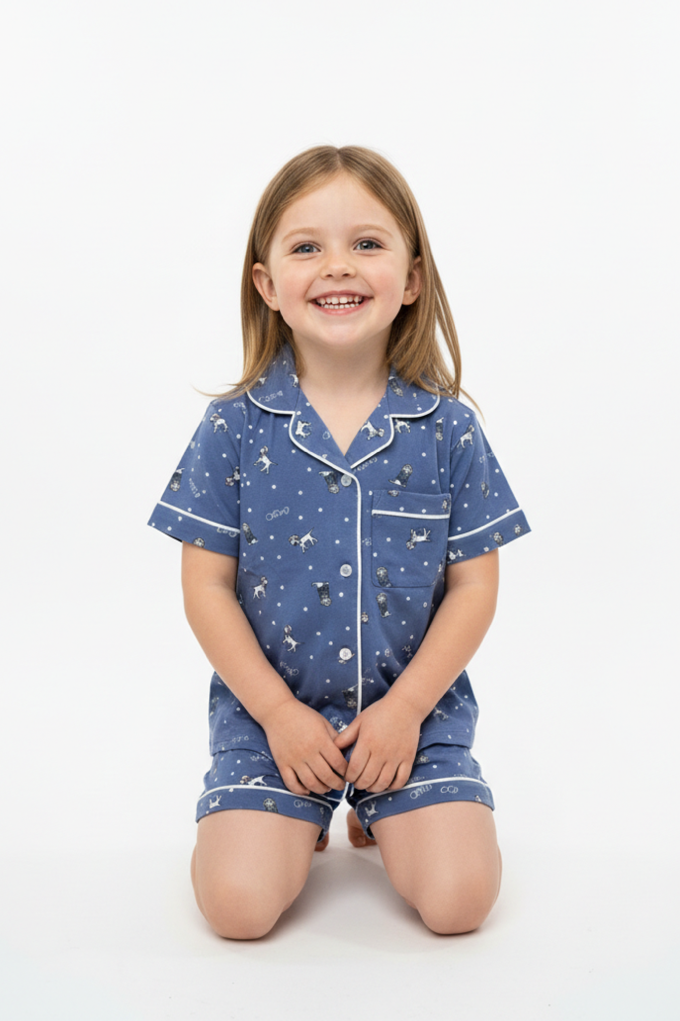 Họa tiết những chú cún nhỏ đáng yêu kết hợp cùng các chấm bi trắng trên nền xanh thanh lịch tạo nên sự trẻ trung, gần gũi. Đây là sản phẩm thuộc dòng Family Set, giúp bạn dễ dàng diện đồ đồng bộ cùng vợ và các con, tạo nên những khoảnh khắc gia đình ấm áp và đầy phong cách.