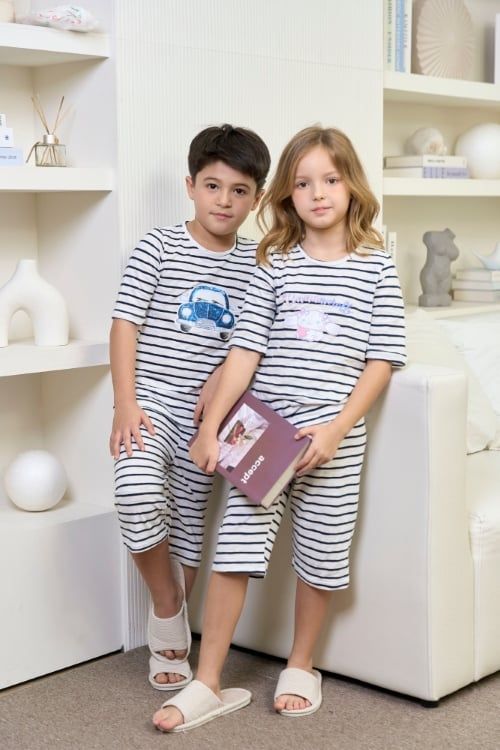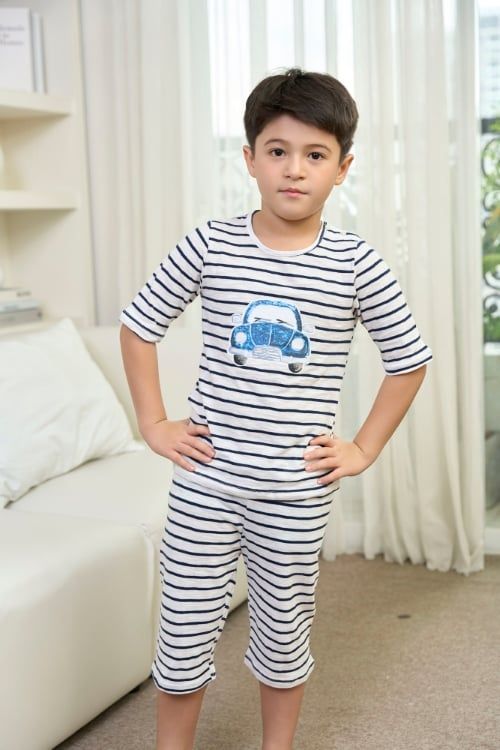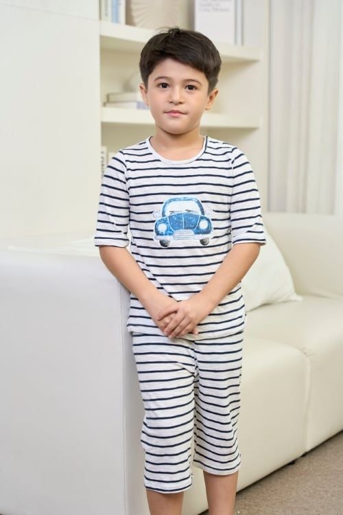 Thiết kế áo cổ tròn đơn giản, dễ mặc, ôm vừa phải nhưng vẫn đảm bảo độ linh hoạt. Hình in xe phía trước tạo điểm nhấn sinh động, phù hợp với sở thích của nhiều bé trai. Quần lửng ống suông dài qua gối, lưng thun co giãn nhẹ giúp bé thoải mái khi vận động và dễ dàng tự mặc.